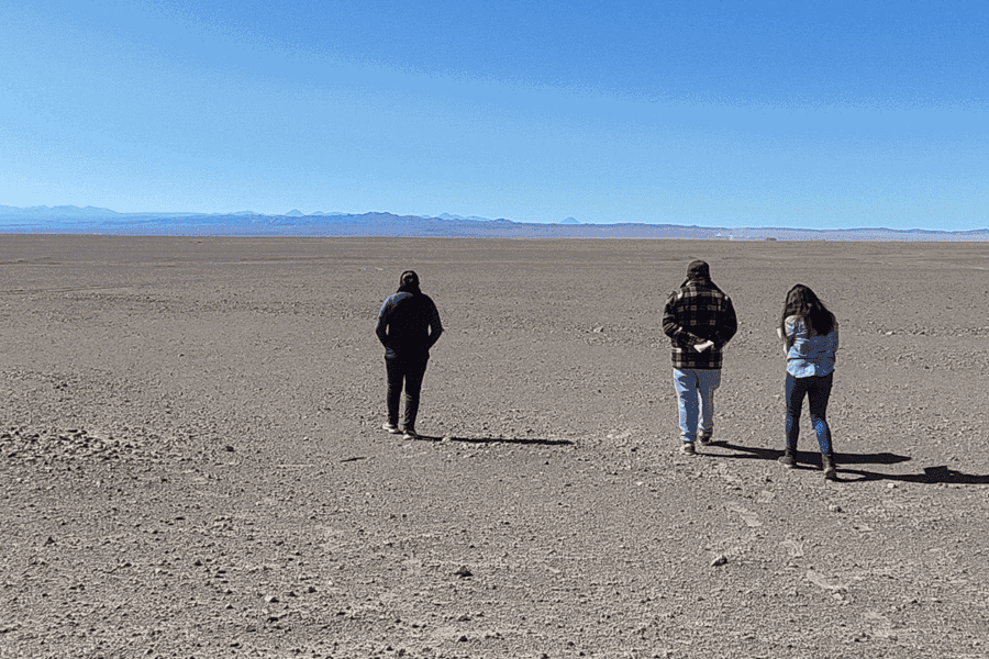Mira el desierto y parece decir “este desierto no es mío, este lugar ‘soy yo’, le pertenezco”, y es importante que a cada paso todos estemos atentos a lo que vamos pisando. Ella va liderando el grupo, el resto la sigue y va indicando dónde parar, hacia dónde caminar, vamos a mirar allá. ¿Qué significa esta piedra, le sirvió de algo para el paso a mis antepasados? ¿Qué nos quiere decir este desierto-mar que ya no existe, pero ha existido?