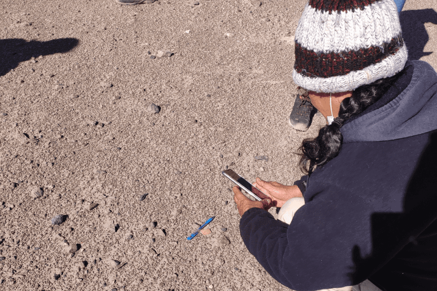 Una vez en el lugar, la señora Carmen baja del bus y mira. Se detiene y toca el suelo. Y cuando encuentra una concha, una piedra o un hueso, pone cerca un bolígrafo, se agacha y saca una foto con su celular. Ha aprendido que para catalogar objetos necesita usar algo como unidad de medida.